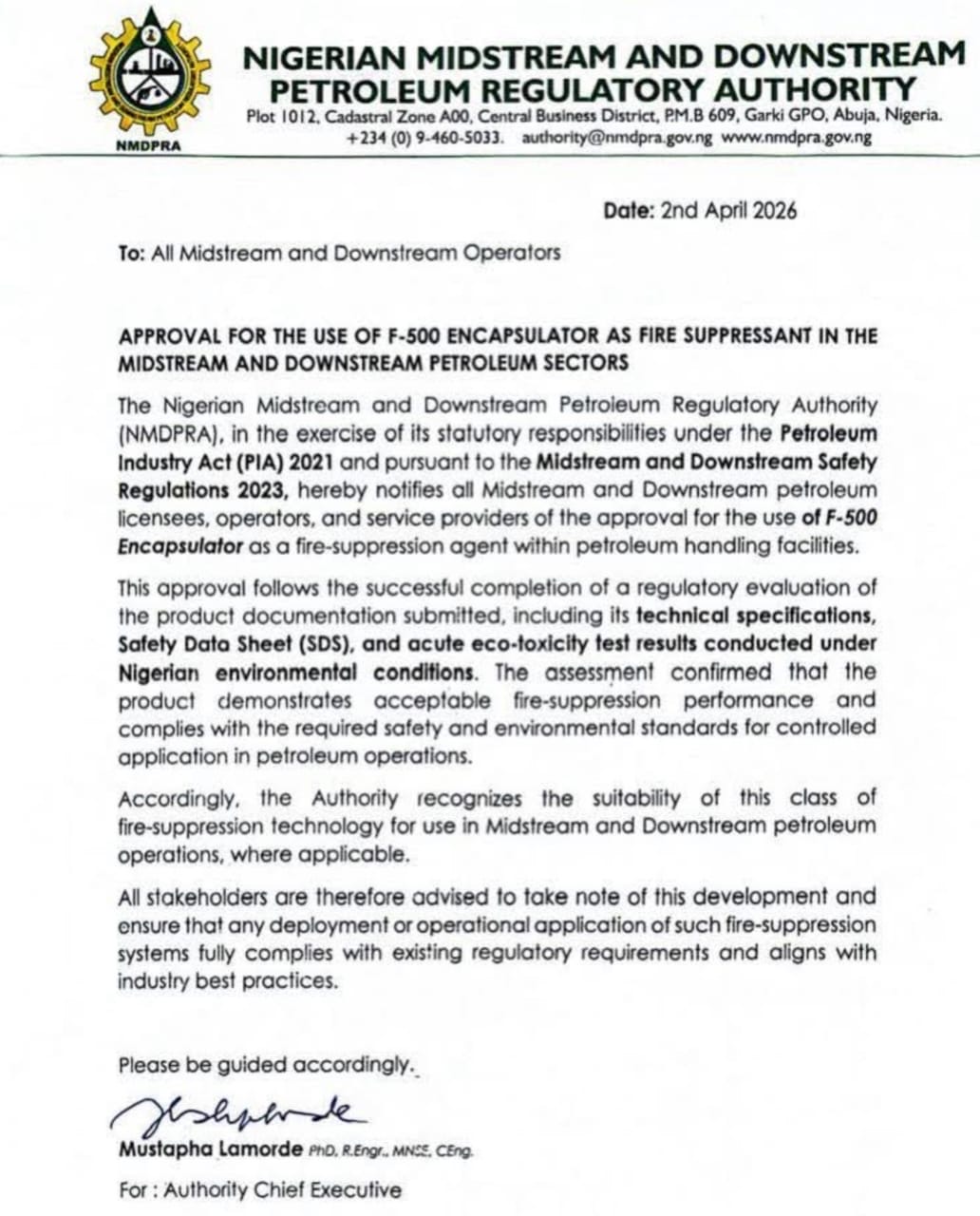 The fluorine-free agent is now cleared for deployment in depots, pipelines and processing facilities, the NMDPRA said in a circular dated March 12, 2026 and signed by Mustapha Lamorde, PhD, on behalf of the Authority Chief Executive.