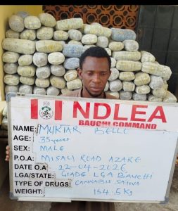 While a suspect Rasheed Ibuowo, 40, was arrested at Mile 2 expressway in Lagos on Saturday 25th April conveying 810 kilograms of Arizona, a strain of cannabis, another suspect Muktar Bello, 35, was nabbed by NDLEA operatives on Wednesday 22nd April at Misau road, Azare/Katagun LGA, Bauchi state with 288 blocks of skunk weighing 154.5kg.