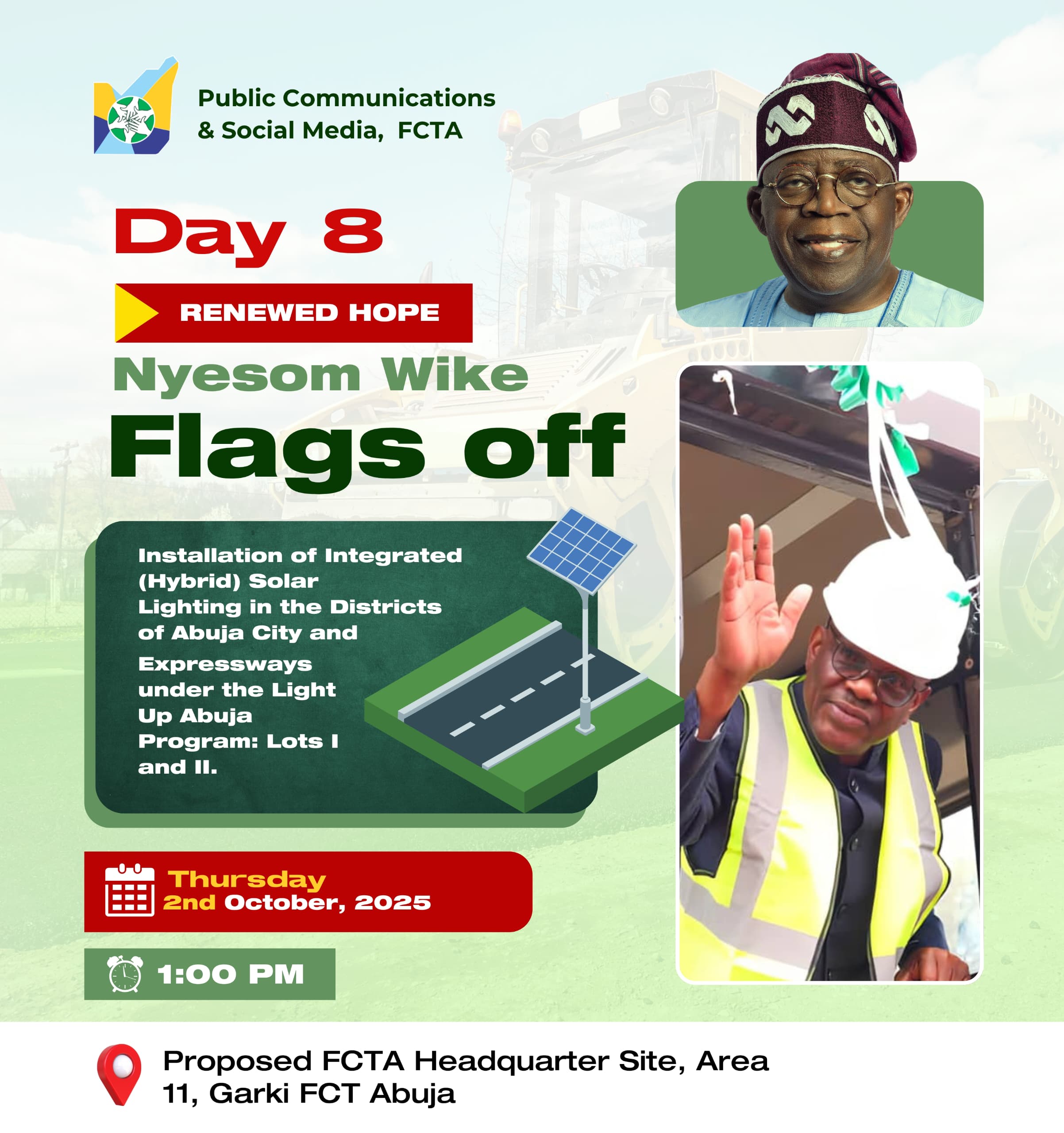 FCT Minister, Nyesom Wike, will flag off the installation of Integrated (Hybrid) Solar Lighting in the Districts of Abuja City and Expressways under the Light Up Abuja Program: Lots I and II, today.